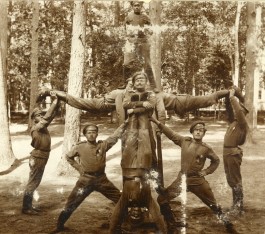 Latviešu strēlnieks meistaro, vingro, dzied un spēlē teātri